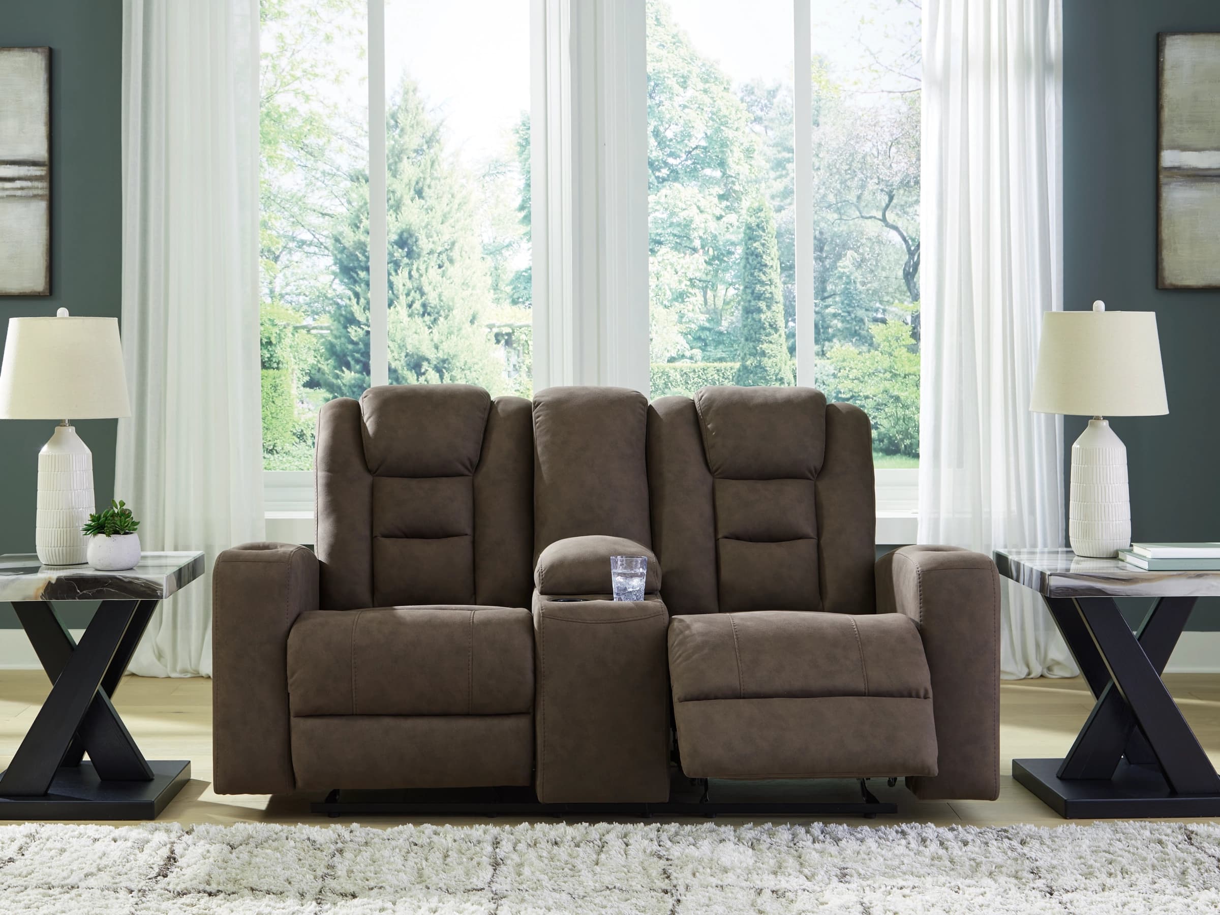 The Mayhem Madness Manual Glider Loveseat with Console – $799 features dual reclining seats and a built-in console, perfect for movie nights.